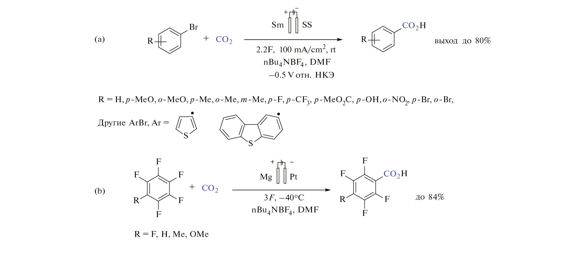 Растворимый анод из самария эффективен для электрокарбоксилирования арилгалогенидов с участием CO2 с получением соответствующих ароматических кислот (схема 23, a) [59]. Предположено, что электрогенерированный при анодном растворении самария Sm(II)X2 первоначально восстанавливает CO2 в результате одноэлектронного переноса (SET) с образованием активного анион-радикала SmIII–[CO2]•−. Последний достаточно реакционноспособен, чтобы атаковать арилгалогенид по механизму радикального замещения, образуя после обработки соответствующую карбоновую кислоту. В отсутствие арилбромида получается оксалат самария. Радикальный характер механизма реакции подтверждали ингибированием в присутствии ТЕМPO.