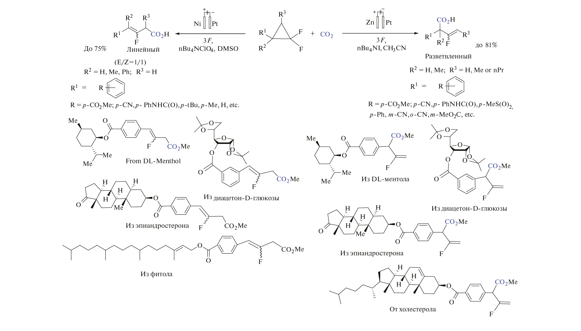 Региоселективный синтез монофторированных алкенов из фторалкенилирующих строительных блоков, таких как гем-дифторциклопропаны, представляет собой сложную задачу. Недавно описано региодивергентное дефторирующее карбоксилирование гем-дифторциклопропанов в электрохимических условиях (e-DFC) (схема 25) [62]. Ряд разветвленных и линейных β,γ-ненасыщенных монофторалкенкарбоновых кислот получен с выходами от умеренных до высоких и с исключительной региоселективностью. Методика проста и соответствует принципам “зеленой химии”. В качестве источника C1 брали атмосферный CO2 и не использовали переходные металлы. Реакция масштабируется и применима на поздней стадии функционализации сложных соединений. Интересно, что никелевый анод благоприятствует синтезу линейных продуктов, а цинковый – разветвленных. Во всех случаях использовали электролизер без разделения анодного и катодного пространства, поэтому роль ионов (Ni или Zn), генерируемых в ходе электролиза, существенна, хотя и не очень понятна. Предложенный механизм рассматривает все возможные маршруты – как начинающиеся с восстановления СО2, так и с восстановления гем-дифторциклопропана, однако никакие стадии исключить или доказать не удалось [62].