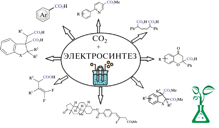Дефицит энергии и загрязнение окружающей среды – две основные глобальные проблемы, стоящие перед человечеством. Текущее мировое потребление энергии сильно зависит от ископаемого топлива. Растут опасения, что активизация деятельности человека не только ускорит потребление ископаемого топлива, но также приведет к увеличению выбросов парниковых газов, нарушит углеродный баланс и приведет к изменению климата [1–4]. Поиск решений проблемы эффективного снижения уровня CO2 в атмосфере и использования углекислого газа в дальнейшем стал важной темой исследований во всем мире. Однако, кроме сокращения выбросов, особое внимание стали уделять возможности использования СО2 в качестве нового углеродного сырья для синтеза и электросинтеза как простых продуктов, таких как CO, муравьиная кислота, метиловый спирт, так и более сложных С2+ [5–23] молекул, в том числе для функционализации, особенно на позддней стадии (late-stage functionalization), структурно разнообразных практически важных соединений, биологически активных и фармакологически интересных [9, 24–27]. Такой подход позволяет избежать использования ископаемых ресурсов при переходе к более экологически приемлемому будущему производству, соответствующему концепции устойчивого развития. Обнаружение новых селективных реакций превращения СО2 или использования его для создания новых функциональных групп в сложных молекулах в последние годы подогревает интерес к этой тематике использования CO2 как строительного блока в органическом синтезе. Электрохимическое восстановление CO2 (аббревиатура CO2RR) является многообещающим и сравнительно легко реализуемым методом экологически безопасного преобразования CO2 в химические соединения с добавленной стоимостью (added value) или топливо [8–23]. В общем случае для активации углекислого газа необходимы электрокаталитические условия, либо участие гомогенных катализаторов – металлокомплексов или солей металлов, либо содействие гетерогенных или наногетерогенных каталитических систем, когда эта реакция активации происходит на электродах разной природы, часто модифицированных всевозможными металлоорганическими или неорганическими производными металлов. В настоящем обзоре обобщены последние достижения в области электрохимических превращений СО2 как строительного блока для конструирования и функционализации разнообразных органических молекул, в первую очередь, методом электрокарбоксилирования. Электрохимические преобразования органических субстратов в присутствии СО2 в новые более сложные практически значимые продукты в одну стадию, особенно в результате прямой функционализации–карбоксилирования связи С–Н, описаны в литературе в гораздо меньшей степени [9, 27], чем электрокаталитические превращения собственно СО2 в простые и недорогие С1 продукты с прицелом на их крупномасштабное производство (CO, HCOOH, CH3OH и т.п.) [8–23, 28]. Хотя механизмы этих реакций не исследованы в полной мере, поскольку выделение и изучение свойств интермедиатов затруднительно, тем не менее практически всегда предлагается тот или иной путь, который определяется, как правило, потенциалами восстановления реагентов.