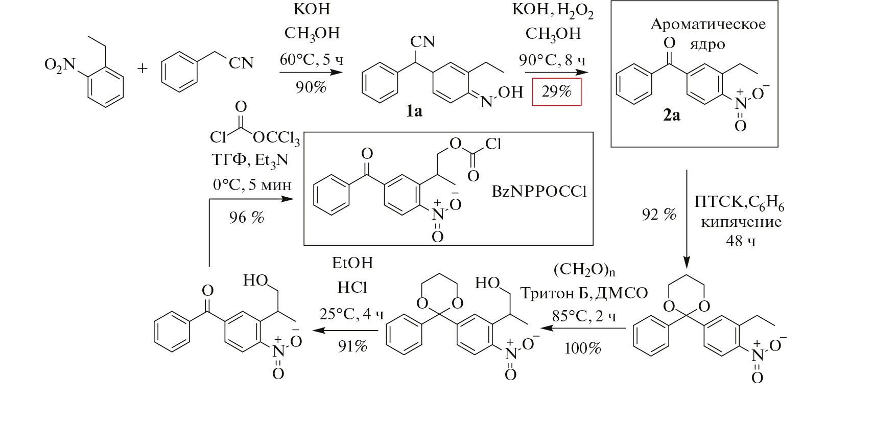 Значительной сложностью синтеза фотозащитных групп этого класса является формирование ароматического ядра с нужным расположением заместителей. В литературе описан метод получения (3-этил-4-нитрофенил)фенилкетона и фотолабильной защитной группы (BzNPPOCCl) на его основе из цианистого бензила и орто-нитроэтилбензола (схема 1). Несмотря на высокий выход промежуточных соединений в данной схеме синтеза, использование ее для наработки граммовых количеств фотолабильной защитной группы осложнено низким выходом процесса конверсии оксима 1а в нитропроизводное 2a [3].