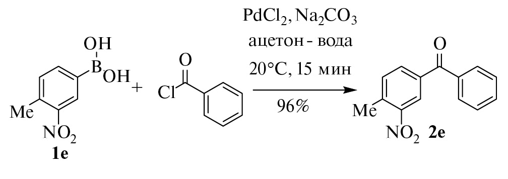 (4-Метил-3-нитрофенил)фенилкетон 2e получен в результате безлигандной палладий-катализируемой реакции между арилборной кислотой 1e и бензоилхлоридом (схема 4).