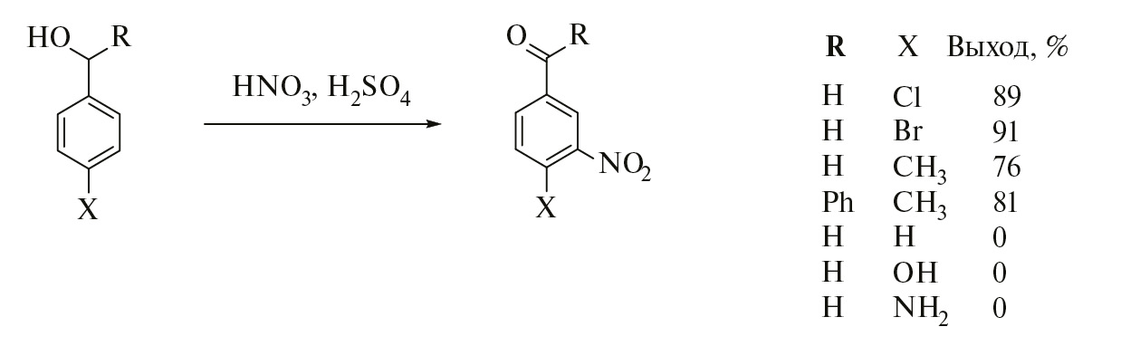 Обработкой 4-замещенных бензиловых спиртов 1b–d смесью концентрированных растворов азотной и серной кислот в мольном соотношении 1 : 10 : 10 при температуре 23°С в течение 1 ч удалось получить соответствующие 4-замещенные 3-нитрофенилкарбонилы 2b–d с хорошим выходом (схема 5).