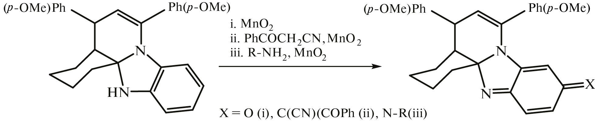1,5-Diketone, obtained by the reaction of 4,4′-dimethoxychalcone with cyclohexanone, interacts with o-phenylenediamine to give 5,7-bis(4-methoxyphenyl)-1,2,3,4,4,4a,5-hexahydro-13H-benzimidazo[2,1-j]quinoline. Oxidation and oxidative coupling reactions with some primary amines and benzoylacetonitrile have been studied, resulting in the formation of heterocyclic p-quinonoid compounds.
