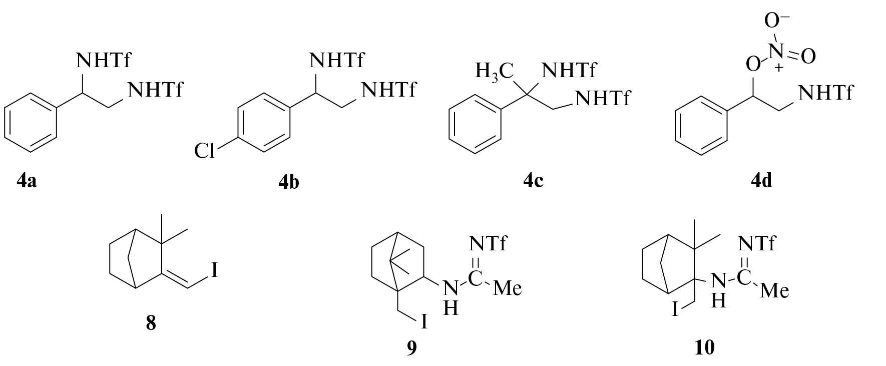 Структура полученных соединений доказана методами ЯМР- и ИК-спектроскопии. Соединению 8 соответствует структура N-(1-(йодметил)-7,7-диметилбицикло[2.2.1]гептан-2-ил)-N′-(трифлил)ацетамидамида, что подтверждается наличием в спектре 1H ЯМР синглета при 7.3 м.д. NH группы, дублетов при 4.7 и 3.5 м.д. с J 10.8 Гц, характерных для фрагмента CH2I, и квартета при 3.9 м.д. с J 7.0 Гц, соответствующего CHN-фрагменту. В углеродном спектре соединения 8 наблюдаются сигналы амидинового фрагмента при 169.4 м.д., квартет при 120 м.д. (J 319 Гц) группы CF3 и 8 м.д. CH2I фрагмента.