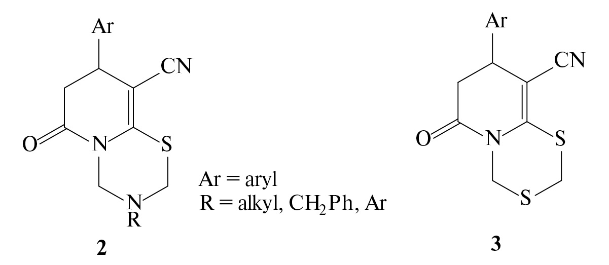 Ранее нами было показано, что взаимодействие N-метилморфолиния 4-арил-6-оксо-3-циано-1,4,5,6-тетрагидропиридин-2-тиолатов 1a–f в условиях реакции Манниха с первичными аминами и избытком формальдегида протекает с образованием производных пиридо[2,1-b][1, 3, 5]тиадиазина 2 [11]. Предполагалось, что замена в этой реакции аминов на сероводород в результате процессов циклотиометилирования [12] может привести к получению пиридо[2,1-d][1, 3, 5]дитиазинов 3.