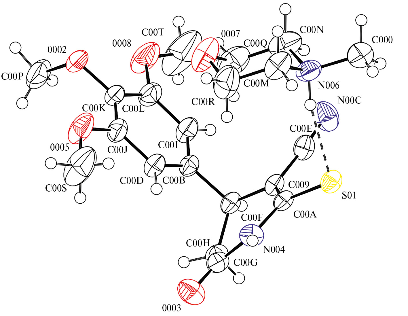 Рис. Атомно-молекулярная структура соединения 1f. Тепловые эллипсоиды неводородных атомов показаны на уровне 50% вероятности нахождения атома.