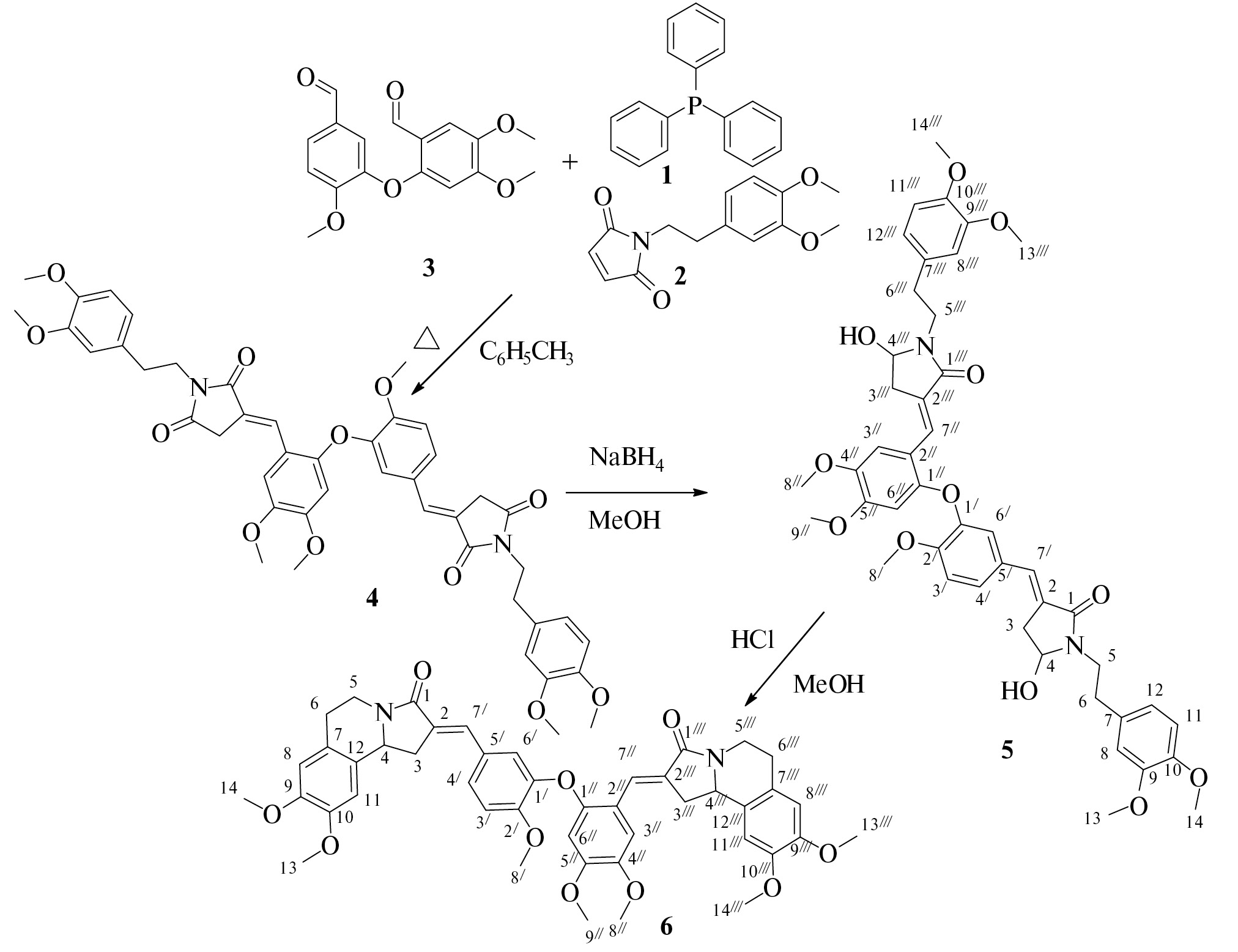 Реакция образования имида 4 протекает при трехкомпонентном взаимодействии двукратных избытков трифенилфосфина (1) и N-гомовератрилсукцинимида 2 с диариловым эфиром 3 (эрнандиаль). В результате образуется фосфоран, который по Виттегу взаимодействует с альдегидными группами диарилового эфира 3 в среде кипящего толуола. Доказательством образования фосфорана является характерная ярко-красная окраска при отдельном смешивании эквимольных количеств трифенилфосфина с N-гомовератрилмалеимидом (2) в среде сухого ацетона, также наблюдали характерное длинноволновое смещение в ИК-спектре полосы поглощения карбонильной группы, связанной с карбанионом, в области ν ~ 1633 см–1. После охлаждения реакционной массы до комнатной температуры выпавший осадок имида 4 отфильтровывали и без дополнительной очистки вводили в реакцию восстановления NaBH4 при температуре 0–5°C в среде метанола. Реакция проходила по наиболее удаленному от диарилового фрагмента кислороду карбонильных групп соединения 4 с образованием соединения 5. Синтез изохинолина 6 осуществляли в условиях реакции Пикте–Шпенглера [2, 3] при добавлении конц. HCl до кислой среды, далее реакционную смесь кипятили в течение 6 ч в среде метанола. Ход реакции контролировали с помощью ТСХ. По окончании реакции маточный раствор упаривали, остаток растворяли в H2O, экстрагировали EtOAc и хроматографировали на SiO2 (хлороформ–ацетон, 9:1).