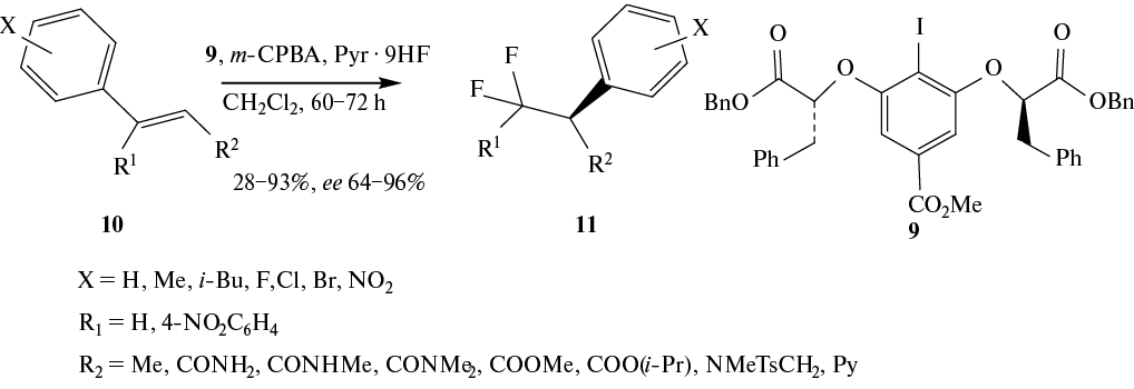 Взаимодействие гипервалентного йодарена, образующегося in situ при окислении хирального арилйодида 9, со стиролами 10 приводит к энантиообогащенным дифторпроизводным 11 через 1,2-миграцию арила (схема 6) [30].
