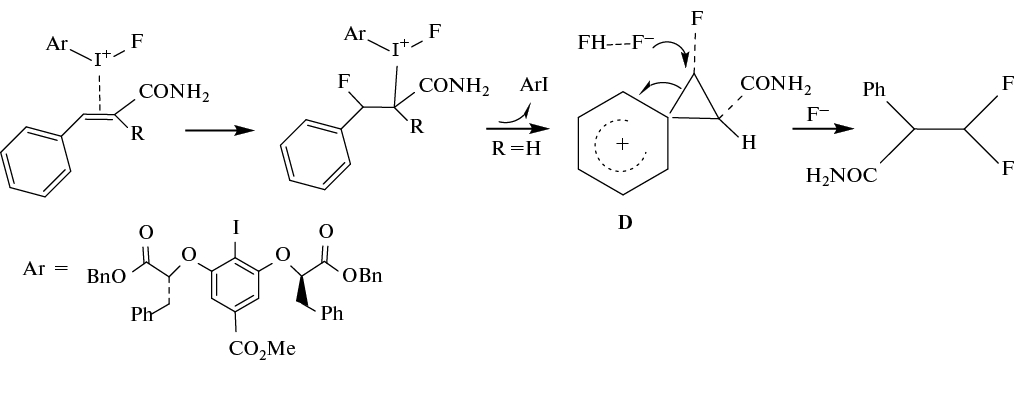 Предполагается, что реакция идет с образованием фенониевого интермедиата D, а стереоспецифичность реакции определяет катион-π-взаимодействие в π-комплексе ArFI+ c олефином (схема 7) [30].