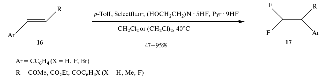 Аналогично, благодаря высокой миграционной способности арильной группы, фторирование сопряженных ароматических алкенов 16 дает дифториды 17 (схема 10) [34].