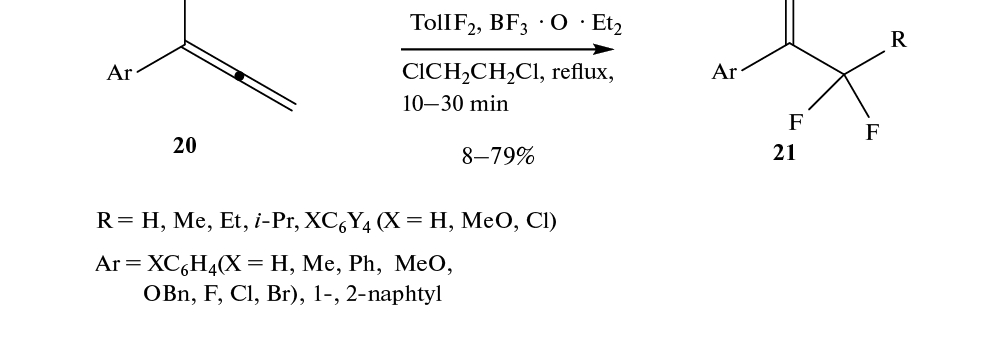 Арилаллены 20 подвергаются перегруппировке под действием дифторйодтолуола в присутствии 20 мол. % BF3 · OEt2 с образованием дифторметилстиролов 21 (схема 13). Отсутствие перераспределения дейтерия в аллене 22 (схема 14) и высокая эндотермичность реакции в случае субстрата с Ar = p-CF3C6H4 соответствуют механизму с миграцией фенильной группы (схема 15) [36].
