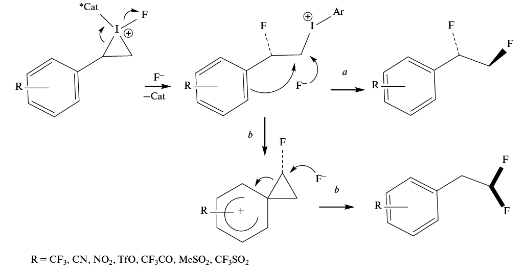 Предложен метод энантиоселективного каталитического вицинального фторирования электронодефицитных стиролов 24 с использованием производного резорцина 25 в качестве катализатора (схема 16). Влияние заместителей X на соотношение вицинального продукта к геминальному увеличивается с ростом акцепторной способности заместителя и описывается уравнением Гаммета. Увеличение соотношения Pyr · (HF)x с 1 : 9.2 до 1 : 4.5 при фторировании 4-нитростирола привело к увеличению соотношения геминального к вицинальному продуктов. Предполагается, что конкуренция между замещением группы ArI анионом F–, дающим вицинальный продукт 26 (путь а), или образованием фенониевого иона, приводящим к геминальному продукту 27 (путь b), определяет соотношение этих продуктов (схема 17) [37].