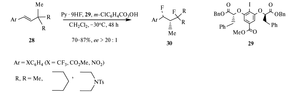 Разработан энантиоселективный синтез β,β-дифторалкилбромидов 67 из бромолефинов 68, катализируемый йодареном 69 в присутствии Py · 9HF в качестве источника фтора и мета-хлорнадбензойной кислоты как окислителя. Предполагается, что трансформация включает окислительную перегруппировку бромзамещенного олефина с образованием бромониевого катиона O (схема 37) [53].