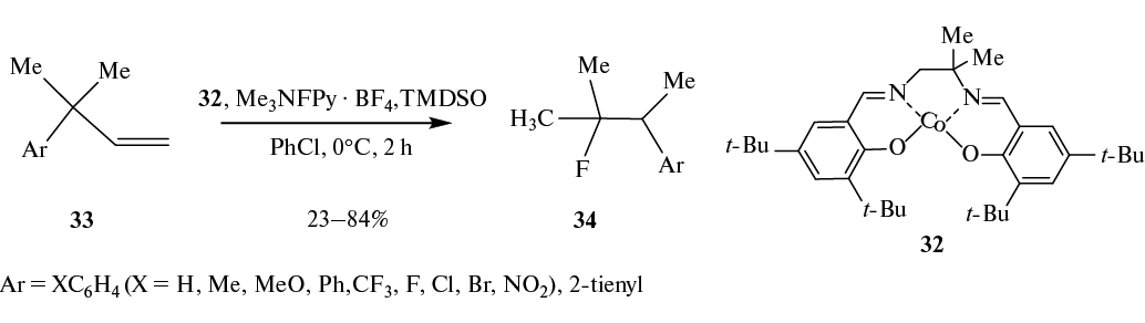 Катализируемая комплексом кобальта 32 перегруппировка Вагнера–Меервейна с миграцией арильной группы при фторировании аллильных производных 33 реагентом Me3NFPy · BF4 приводит к образованию фторидов 34 (схема 20) [39].