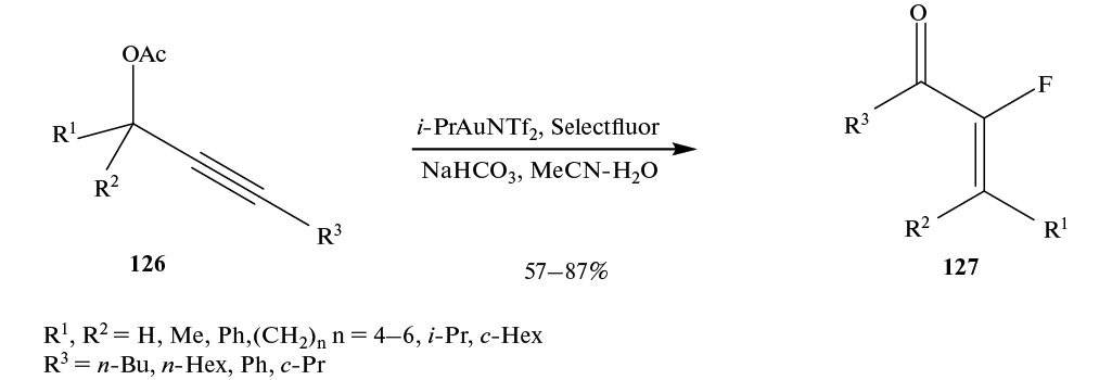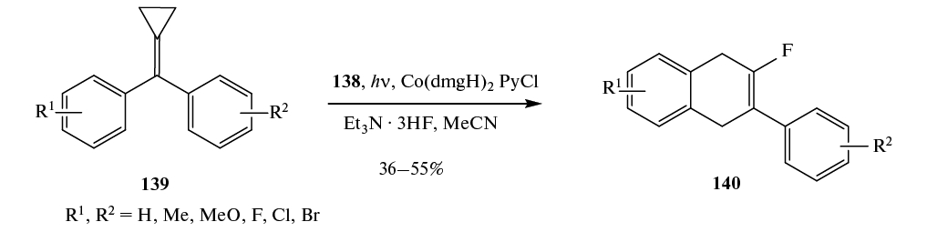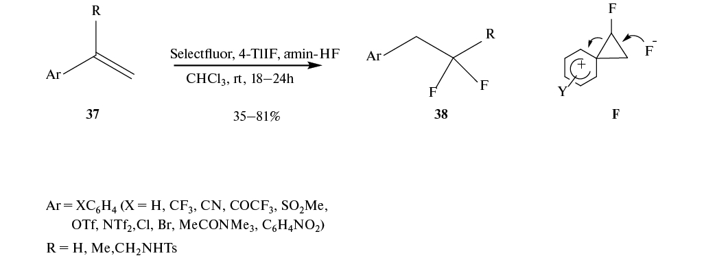 При фторировании метиленциклопропанов 39 реагентом Selectfluor в присутствии Py · HF образуются дифториды 40. Предполагается, что реакция идет с образованием интермедиатов G, подвергающихся перегруппировке Вагнера–Меервейна (схема 23). Движущей силой перегруппировки является снятие напряжения в циклопропановом фрагменте [42].