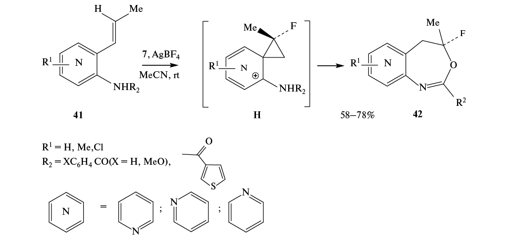 Фторциклизация пиридинилстиролов 41 с использованием фторйодана 7 в присутствии AgBF4 идет селективно с образованием фторпиридилоксазепинов 42. Предполагаемый механизм реакции включает образование интермедиата H фенониевого типа (схема 24) [43].