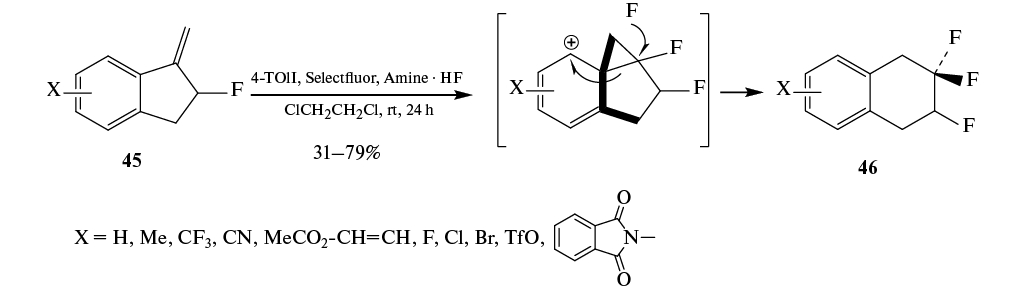 Метиленинданы 45 подвергаются расширению цикла при фторировании реагентом 4-TolIF2, генерируемы in situ из 4-TolI действием реагента Selecfluor, с образованием трифтортетралина 46 (схема 26) [45]. Введение в ароматическое кольцо электронодонорных заместителей Х уменьшает выход трифторида 46, что можно объяснить уменьшением положительного заряда в ароматическом фрагменте фенониевого интермедиата. Выявлена корреляционная зависимость выходов трифторида 46 при использовании σ-констант Гаммета.