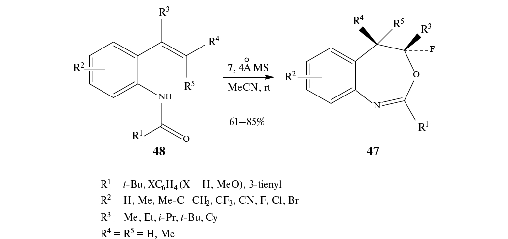 Фторбензйодоксол 7 и молекулярные сита (MS) использованы для получения 4-фтороксазепинов 47 из стиролов 48. Предполагается, что фторирование идет в результате каскадной 1,2-арильной миграции–циклизации (схема 27) [46].