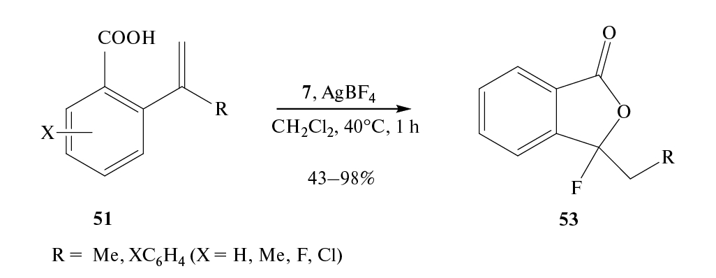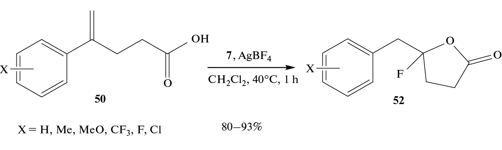 При фторировании кислот 50, 51 действием фторйодана 7 и AgBF4 предполагается, что ключевой стадией является миграция арильной группы (схемы 29–31) [48].