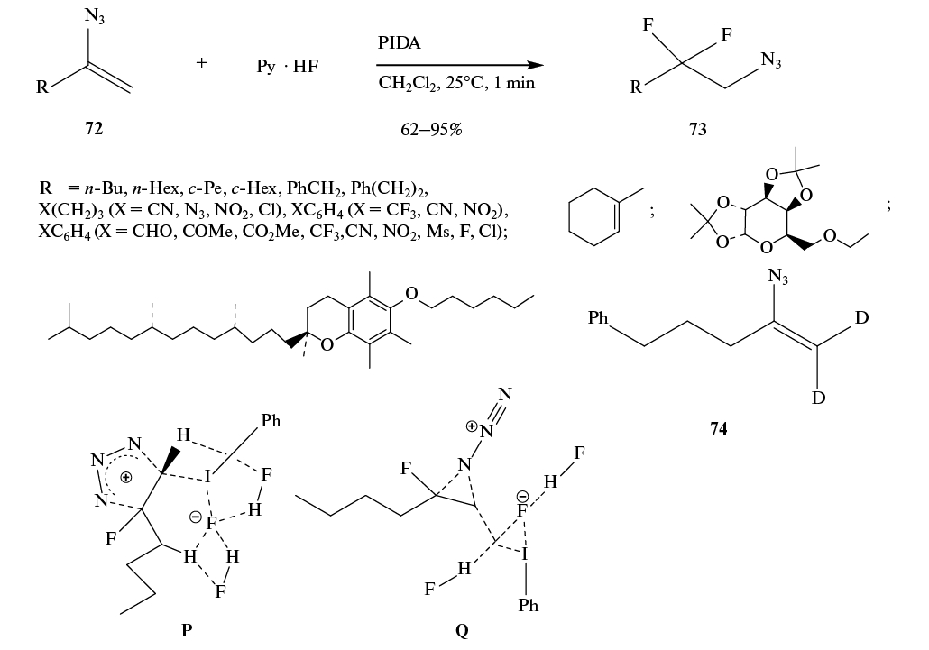 1,2-Миграцию азидной группы наблюдали при фторировании винилазидов 72 под действием генерируемого in situ PhIF2 · HF с образованием дифторазидов 73 (схема 39). Миграцию этой группы исследовали на примере меченного дейтерием субстрата 74, который дает продукт, дейтерированный по атому углерода, связанному с азидной группой, что исключает процесс элиминирования. Расчеты методом M062X/6-31G(d,p)/LANL2DZ показали, что барьер миграции азидной группы с вовлечением пятичленного переходного состояния P выше (67.0 ккал/моль), чем в случае трехчленного переходного состояния Q (15.1 ккал/моль) [55, 56].