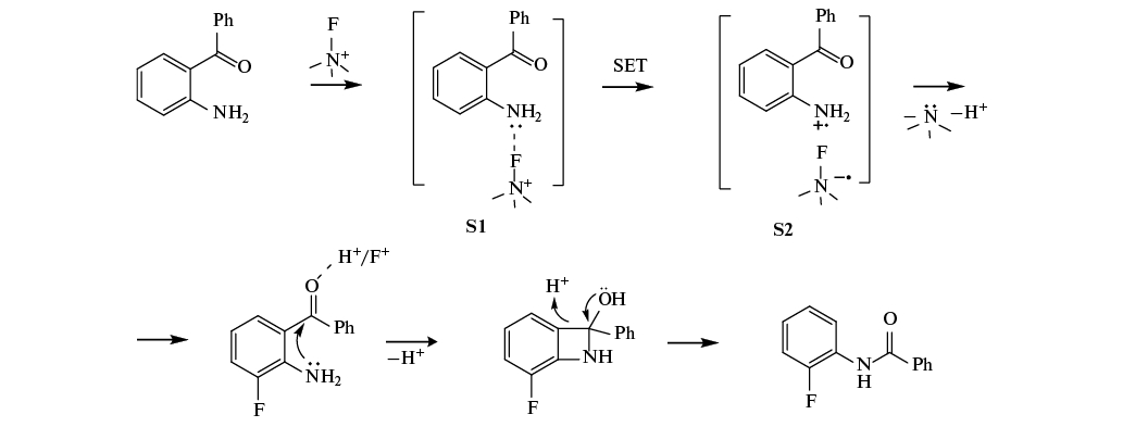 При окислительном фторировании образуются радикалы или катион-радикалы, подвергающиеся молекулярным перегруппировкам.