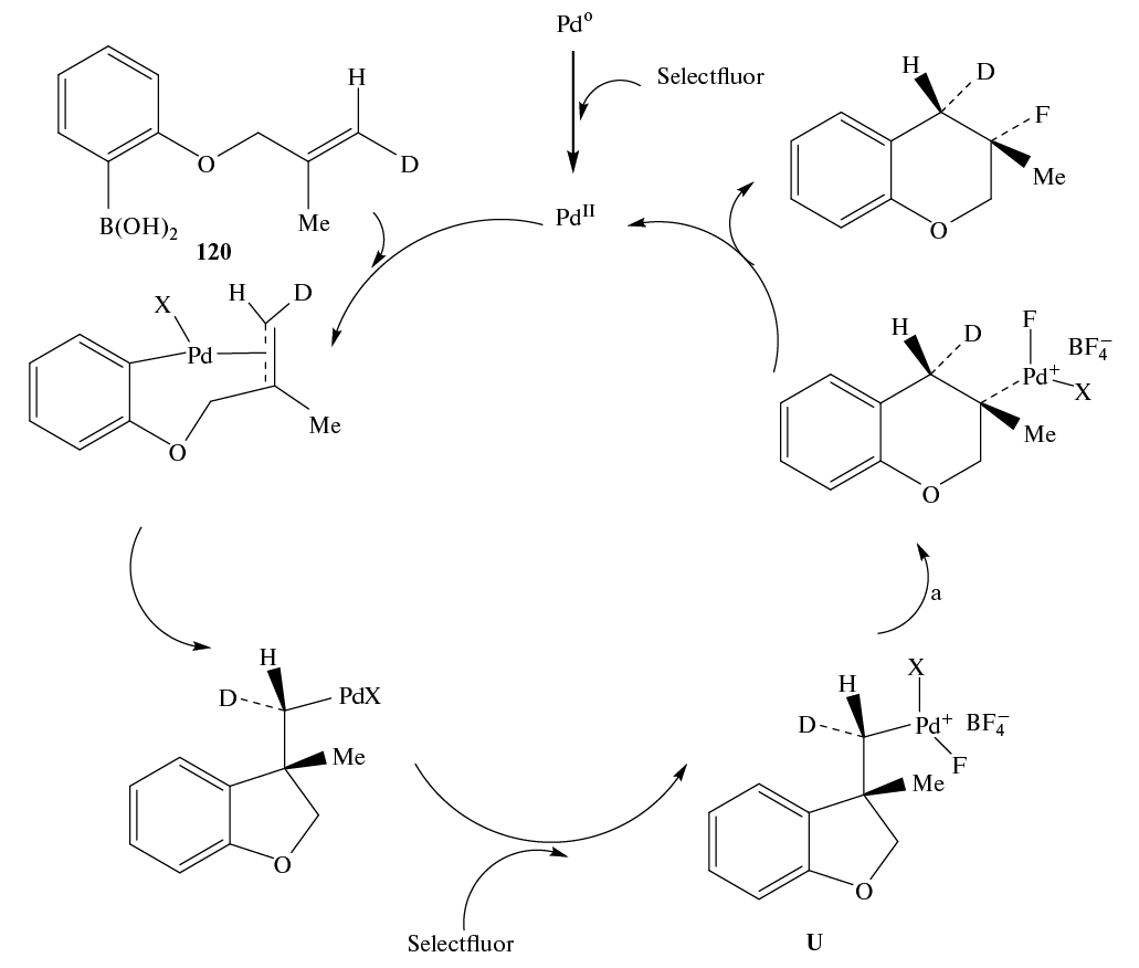 Электрофильное фторирование олефинов 35 реагентом Selectfluor в присутствии 4-MeC6H4I и Py · 9HF осуществляется с миграцией группы BMIDA (N-метилиминодиацетилборонат) с образованием дифторпродукта 36. Согласно квантово-химическим расчетам методом B3LYP-D3(BJ), миграция группы BMIDA может осуществляться через переходное состояние E (схема 21) [40].