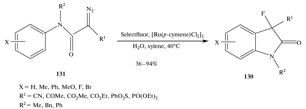 Каталитическое фторирование 1,1-дифенилэтилена 14 с использованием катализаторов ArI (Ar = 2-MeOC6H4, 2-MeC6H4, 4-MeC6H4), м-хлорнадбензойной кислоты (m-CPBA) как окислителя и Py · HF в качестве источника фтора осуществляется с миграцией фенильной группы (схема 9) [33].