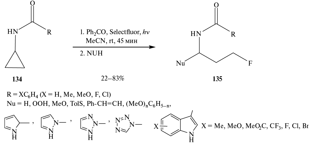 Фторирование производных циклопропана 54, осуществляемое гипервалентным фторйоданом 55, идет с внутримолекулярным расширением цикла с образованием производного пиперидина 56. Предполагается, что в разрезании циклопропанового фрагмента участвует катион L, строение которого подтверждено методом спектроскопии ЯМР 1H, 13C, 11B, 19F (схема 32) [49].