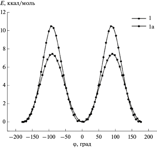 Рис. 2. Сечение ППЭ бензилиденанилина 1 и его протонированной формы 1a как функция двугранного угла φ