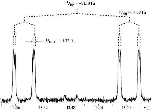 Образование прочной внутримолекулярной водородной связи проявляется в спектрах ЯМР 1Н. Протон кватернизованного атома азота в соединении 3а проявляется в спектре ЯМР 1Н в виде дублета дублетов дублетов (ддд.), что соответствует трем расщеплениям. КССВ через одну связь с атомом азота 15N и вицинальная КССВ с протоном метинового фрагмента имеют весьма характерные значения (рис. 6). Следует отметить, что дальняя КССВ через 5 связей с атомом фтора 5JHF = 1.47 Гц проявляется в спектре благодаря наличию водородной связи. Действительно, проведенные нами тестовые расчеты показали, что если предположить, что величина этой КССВ опредялясь бы передачей через систему пяти последовательных ковалентных связей (F-C2-C1-C7-N-H), она не могла бы иметь столь высокого значения.