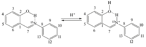 Имеющиеся данные литературы позволяют рассчитывать на то, что ключевая информация о динамической структуре азотсодержащих соединений может быть получена с использованием КССВ 15N–H и 15N–13C [5, 6]. В работе синтезирована серия селективно меченых изотопом 15N соединений, зарегистрированы спектры ЯМР высокого разрешения с использованием метода ЯМР титрования, проведен “встречный” квантово-механический расчет поверхности потенциальной энергии (ППЭ) и целевых КССВ 15N–13C для конформационного анализа изучаемых молекул, как в форме свободных оснований, так и в протонированных формах. На этой базе нами сделана оценка конформационного состояния ряда исследуемых молекулярных систем и проанализирована возможность построения молекулярных переключателей нового типа, основанных за счет образования водородной связи гетероатома заместителя с протоном при азометиновом азоте замещенного бензальанилина.