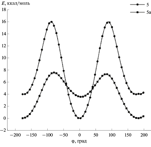 Если вместо гидроксильной группы в положение 2 введена метоксигруппа, конформационное состояние системы существенным образом изменяется. Зависимость ППЭ замещенного бензилиденанилина 5 и его протонированной формы 5а от двугранного угла представлены на рис. 8.