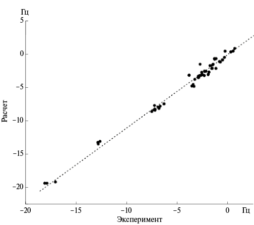 Для уравнения (1) в серии исследованных соединений (59 КССВ) коэффициент корреляции равен 0.988 при значении коэффициента наклона, незначительно отличающемся от единицы (α = 1.077 ± ± 0.015), и практически незначимым свободном члене (β = –0.13 ± 0.09). Среднеквадратичное отклонение экспериментальных и расчетных КССВ составляет 0.27 Гц, что сопоставимо с точностью проведенных нами экспериментальных измерений и всей совокупности квантово-химических расчетов. Совокупность данных по 59 КССВ демонстрирует высокую сходимость вычисленных значений и возможность использования полученных данных для прогнозирования значений новых КССВ.