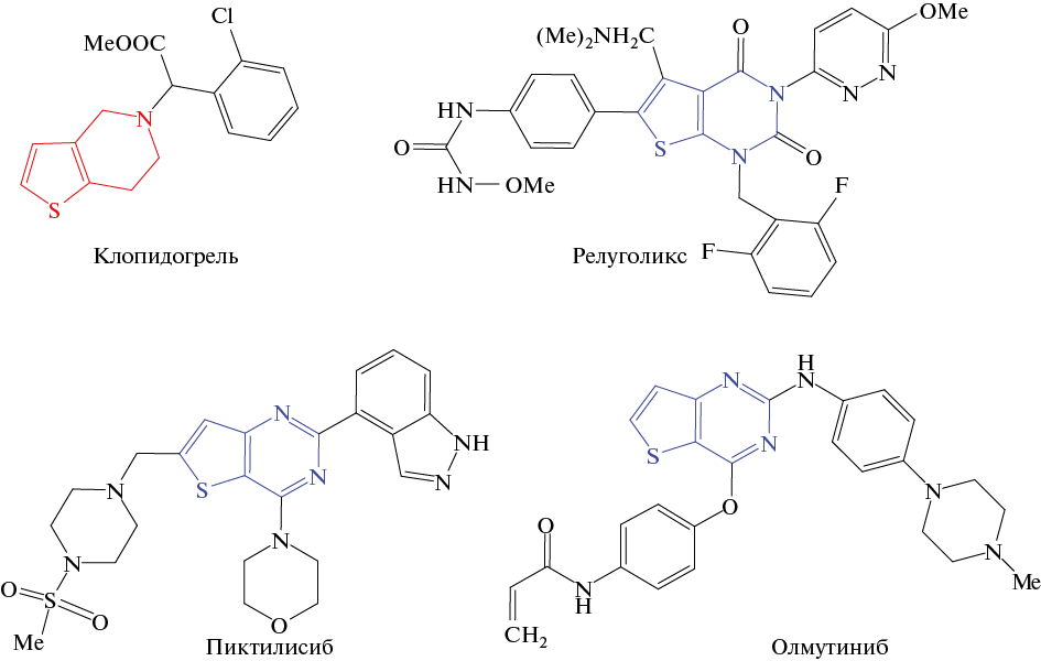 В арсенале широко применяемых лекарственных препаратов особое место занимают соединения, содержащие пиридиновое или пиримидиновое кольца [1]. Kонденсированные пиридин- или пиримидинсодержащие системы оказались наиболее интересными с точки зрения их биологической активности по сравнению с моноциклическими соединениями. Особое место среди них занимают производные тиенопиридинов и тиенопиримидинов, причем наиболее изученными являются химические и биологические свойства тиено[2,3-b]пиридинов, а также тиено[2,3-d]- и [3,2-d]пиримидинов. Интерес к данным гетеросистемам обусловлен их большой практической значимостью, так как многие их производные проявляют широкий спектр биологической активности, включая антиоксидантную, противовоспалительную [2, 3], антибактериальную, противоопухолевую [4–6] и др. Более того, соединения на основе тиенопиридина играют важную роль в качестве антитромбоцитарных препаратов, например, препарат клопидогрель используется для предотвращения тромбов у пациентов, страдающих острым коронарным синдромом или находящихся в группе риска инсульта [7]. Препарат релуголикс (ТАК-385) представляет собой производное тиено[2,3-d]-пиримидина и в настоящее время изучается возможность его применения в терапии эндометриоза и карциномы простаты в качестве антагониста рецептора гонадотропин-рилизинг-гормона (GnRHR) [8]. Кроме того, препарат пиктилисиб (GDC-0941), представляющий собой производное тиено[3,2-d]пиримидина, ингибирует фосфатидилинозитол-3-киназу (PI3K), применяется для лечения запущенных форм опухолей [9]. Тиено[3,2-d]пиримидин (препарат олмутиниб) ингибирует рецептор эпидермального фактора роста (EGFR) и используется в терапии рака легких [10].