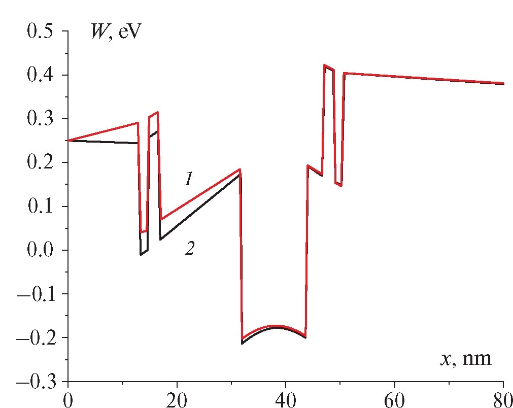 Рис. 3. Результаты моделирования зонной диаграммы исследуемой структуры GaAs/In0.53Ga0.47As: 1 — до облучения; 2 — после нейтронного облучения.