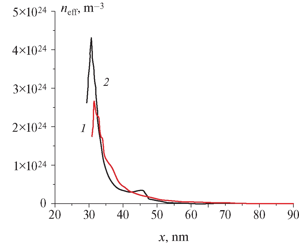 Рис. 4. Эффективный профиль концентрации исследуемой структуры GaAs/In0.53Ga0.47As: 1 — до облучения; 2 — после нейтронного облучения.