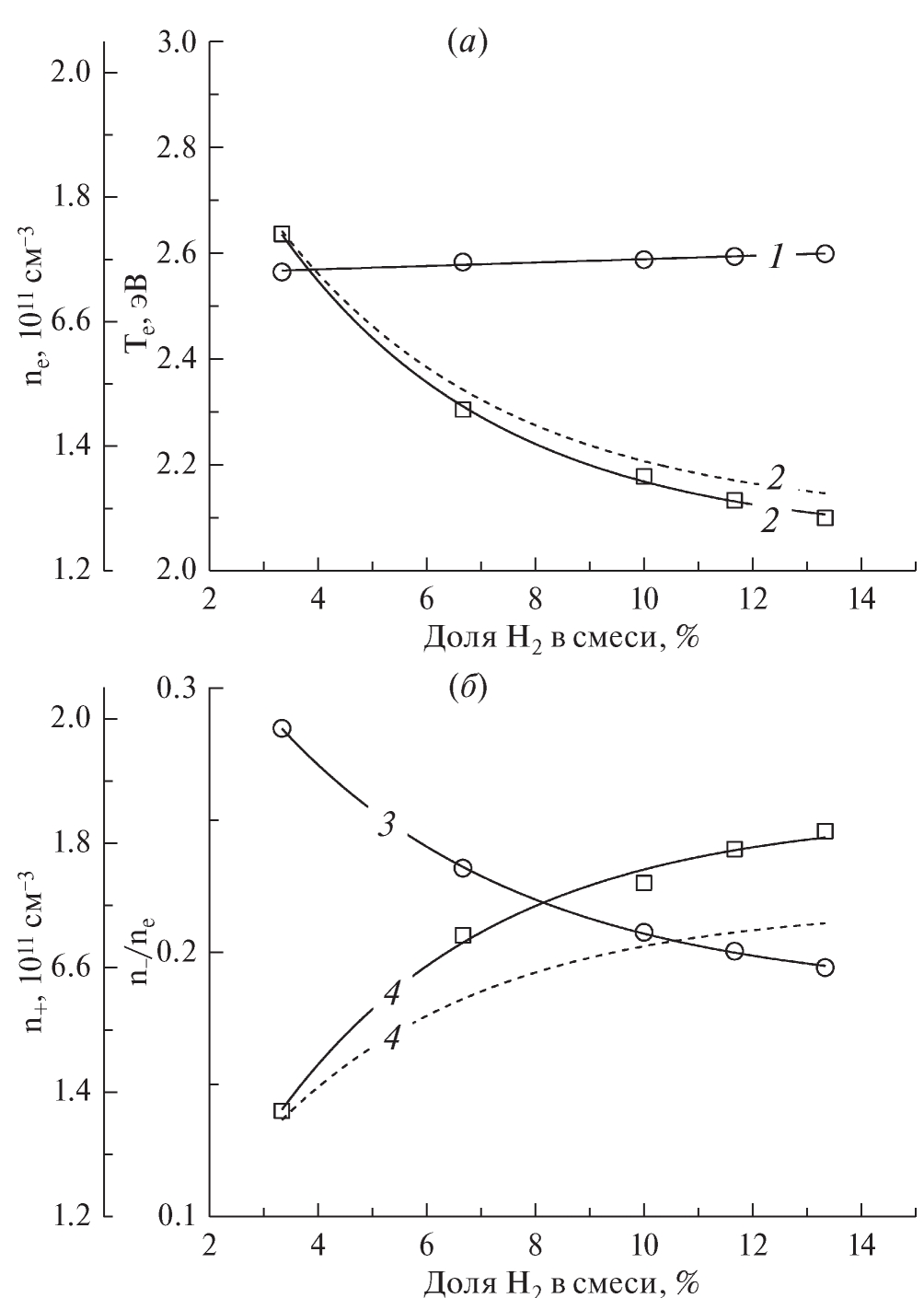 На рис. 1 представлены экспериментальные и расчетные данные по влиянию содержания водорода на параметры электронного и ионного компонентов плазмы. Анализ этих результатов позволяет выделить ряд значимых свойств исследуемой системы, определяющих кинетику плазмохимических процессов и стационарный состав плазмы: