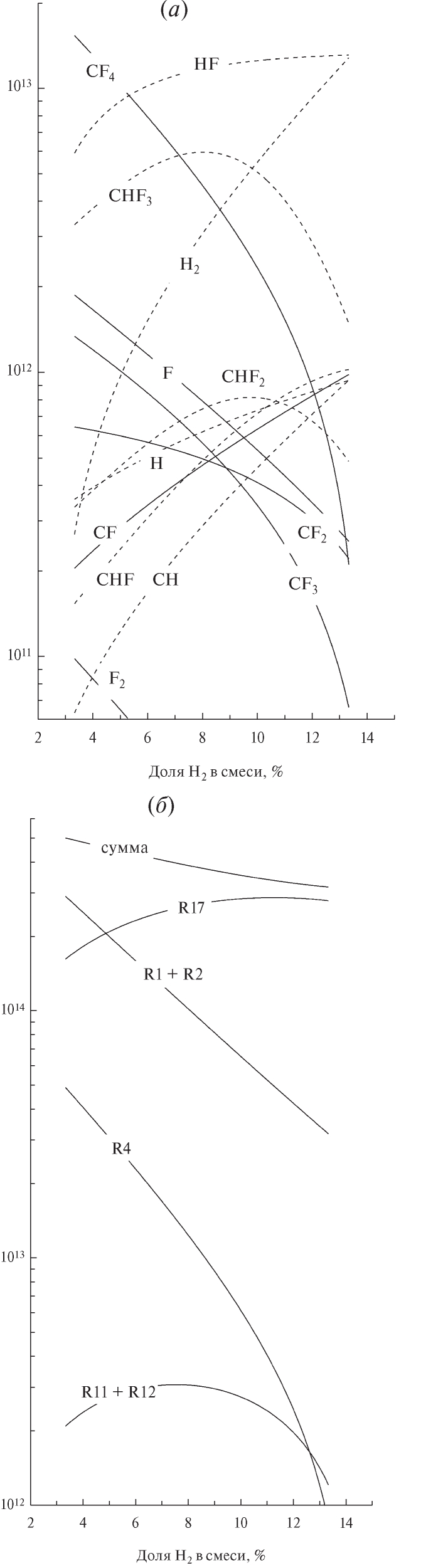 Увеличение доли H2 в смеси обогащает газовую фазу атомами водорода (за счет роста скорости диссоциации молекул H2 по R8, примерно в 35 раз при 3–13% H2), что приводит к перераспределению параллельных каналов рекомбинации в составе R30 и R31 в пользу CFx + H → CHFx. Так как основным фторуглеродным радикалом при отсутствии водорода в смеси является CF3, в качестве доминирующего продукта R30 и R31 ожидаемо выступает CHF3 (см. рис. 2, а). Немонотонное (с максимумом при 6–8% H2) поведение концентрации этих частиц обусловлено аналогичным изменением скорости их образования по причине нарастающего дефицита CF3. Причиной этого является не только замедление генерации CF3 по R1 из-за снижения содержания тетрафторметана в плазмообразующем газе, но и рост частоты гибели этих частиц при взаимодействии с атомами водорода по R26. Кроме того, группа атомно-молекулярных процессов R24–R28 обеспечивает эффективную конверсию F2, CFx (x = 1–3) и CHFx (x = 1–3) в молекулы HF. Это приводит к выполнению условия nHF > и доминированию молекул HF уже при содержаниях водорода в смеси более 5–6%. Отметим также, что константы скоростей R27 и R28 увеличиваются примерно на порядок величины при переходе от более насыщенных к менее насыщенным исходным частицам (например, k27 ~ 3.0 × 10–12 см3/с для x = 3 vs. ~ 3.2 × 10–11 см3/с для x = 2 и 1). Таким образом, преимущественная генерация радикалов с низкими x существенно замедляет снижение концентрации CF2 (примерно в два раза при 3–13% H2) по сравнению CF3 (примерно в 20 раз при 3–13% H2) и приводит к росту концентрации CF. Еще одним важным моментом является тот факт, что частота гибели атомов фтора в паре R25 + R27 превышает совокупный эффект от группы гетерогенных процессов R30–R32. Поэтому добавка водорода приводит к резкому росту частоты гибели атомов F и снижению их концентрации (примерно в 8 раз при 3–13% H2, см. рис. 2, а) на фоне слабого изменения скорости образования этих частиц в процессах электронного удара (см. рис. 2, б). Последний эффект обусловлен тем, что снижение суммарной скорости R1 + R2 почти полностью компенсируется R17, в том числе за счет k17 > k1 + k2. Концентрация атомов водорода ожидаемо увеличивается с ростом доли H2 в смеси, однако характер этого изменения является более слабым по сравнению с (см. рис. 2, а). Причинами здесь являются снижение эффективности образования атомов по R8 из-за аналогичного измерения концентрации электронов, а также их расходование в атомно-молекулярных процессах R24, R26 и R28. Последние составляют реальную конкуренцию гетерогенной рекомбинации атомарного водорода по “классическому” механизму H + H → H2 в составе R32.