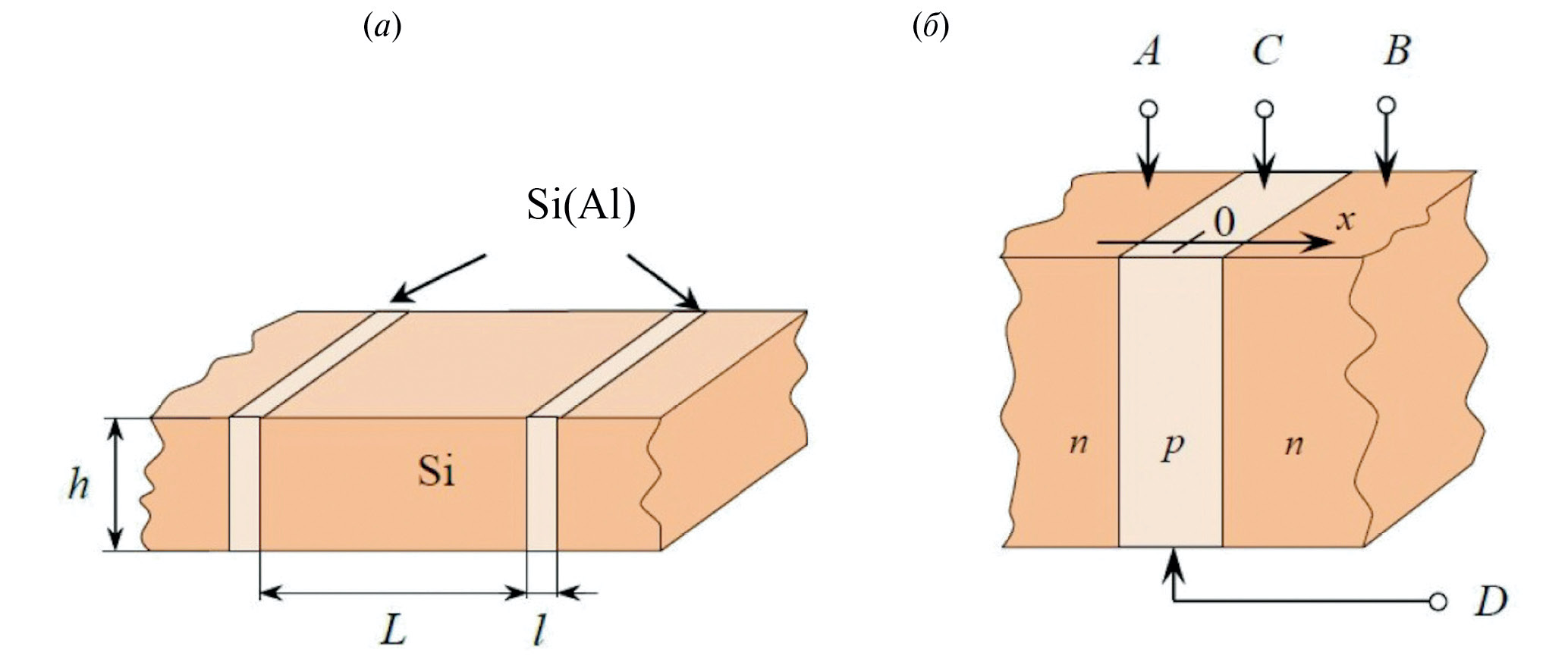 Рис. 1. Фрагмент схемы образца-пластины Si(111) с р-каналами Si(Al) (а) и места контактов для измерения электрических U—I—R-параметров p—n-перехода (б), где h — толщина пластины; L — расстояние между каналами; l — ширина канала; x = 0 — положение центра канала на поверхности пластины.