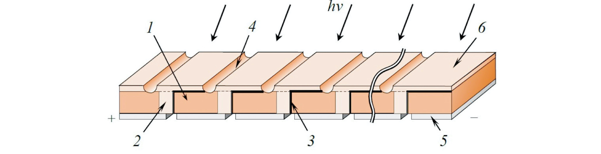 Рис. 2. Схема монолитного солнечного модуля из нескольких элементов: 1 — исходная кремниевая пластина; 2 — p-канал Si(Al) (ThM процесс); 3 — рабочий p—n-переход; 4 — разделительная канавка; 5 — шунт Ag; 6 — p-слой Si(B) (твердотельная глубокая диффузия).