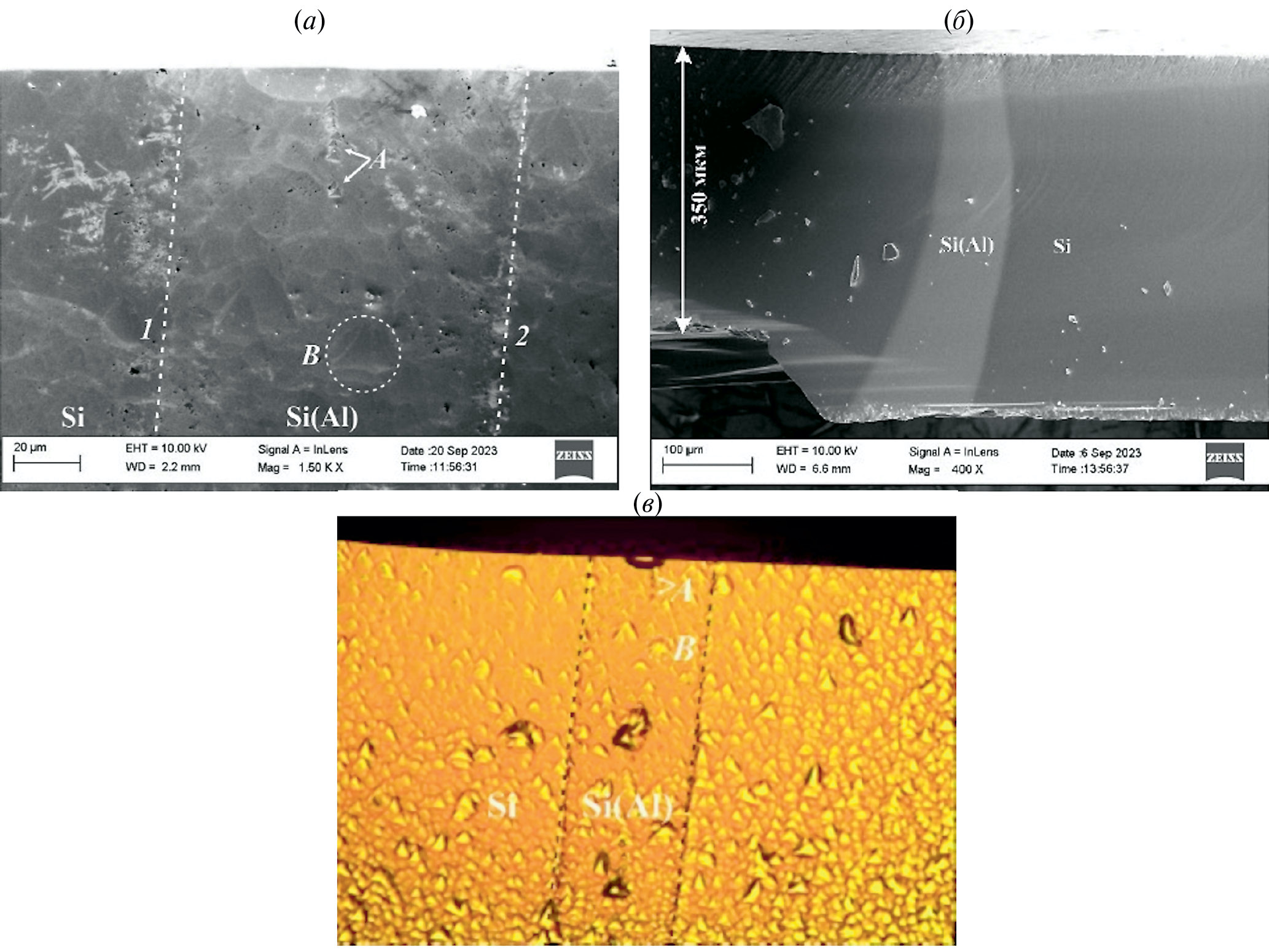 На рис. 3 представлены фрагменты SEM-изображений поверхности (а), скола (б) и микрофотографии поверхности (в) одного и того же участка р-канала шириной 100–110 мкм. Хорошо видно (рис. 3, а), что вид рельефа поверхности канала Si(Al) практически не отличается от вида поверхности матрицы пластины (Si). По всей поверхности изображения наблюдаются слабоконтрастные фигуры травления в виде размытых треугольников, что характерно для поверхности Si(111). Наиболее характерными деталями на SEM-изображении поверхности канала являются его границы (1, 2), состоящие из скопления мелких неоднородных по интенсивности рассеяния участков и ямок травления в виде скоплений равносторонних треугольников (А, В) со сторонами {112}. Ямки травления появляются из-за локальных изменений скорости травления кристалла в местах с неоднородной деформацией. Деформация кристаллической решетки на границах (1, 2) канала вызвана ступенчатым изменением ее состава из-за внедрения в р-канал атомов алюминия. Наличие ямок травления (А) вдоль центра канала, вероятнее всего, связано с локальной деформацией в центре канала вблизи поверхности образца [19].