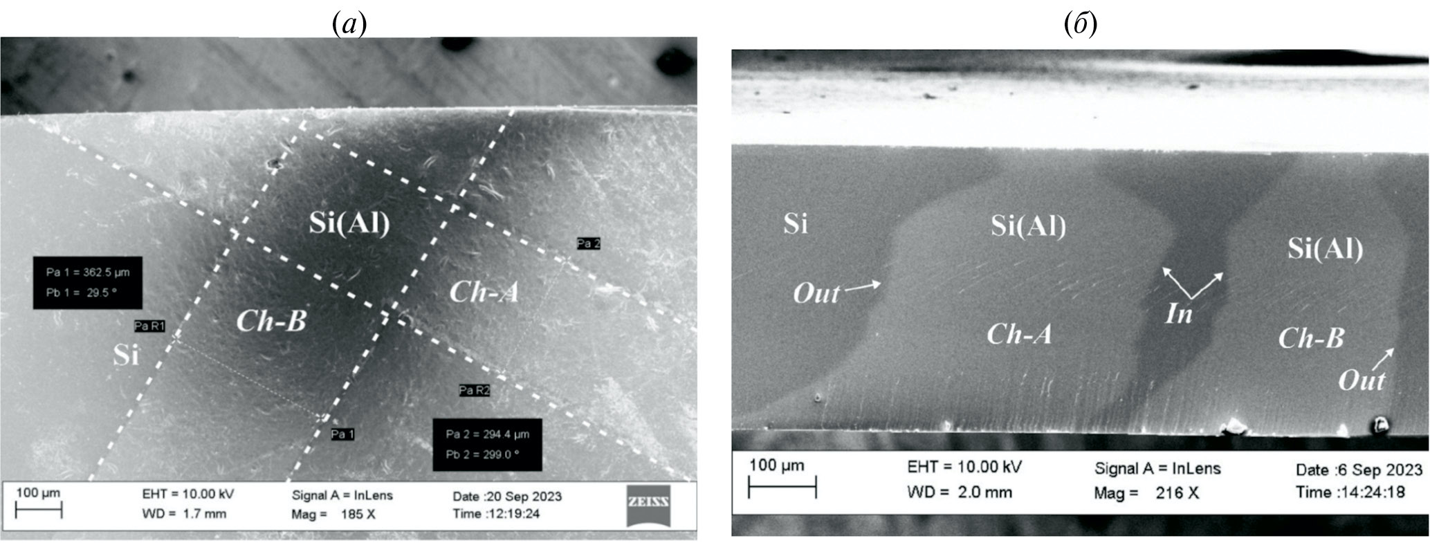 На рис. 4, б видно, что по мере формирования каналов Ch-A и Ch-B переменного сечения их внешние границы (out) выглядят резкими с минимальными искажениями. В то же время на внутренних границах (in) обоих каналов наблюдаются изломы, приводящие к заметному искажению формы каналов и изменению их ширины. Видно, что эти искажения ThM-каналов наблюдаются при примерном равенстве ширины канала и межканального расстояния. По-видимому, здесь проявляется эффект влияния теплового поля соседних расплавов Al(Si) на процесс перекристаллизации на границе фаз (стенок каналов) из-за изменения температуры переохлаждения. Кроме того, сформированные участки канала создают напряжения в матрице пластины, что также должно влиять на формирующийся канал. Оценить размеры этих полей напряжения кристаллической решетки можно на основе данных рентгеновской проекционной топографии и двухкристальных кривых прохождения.