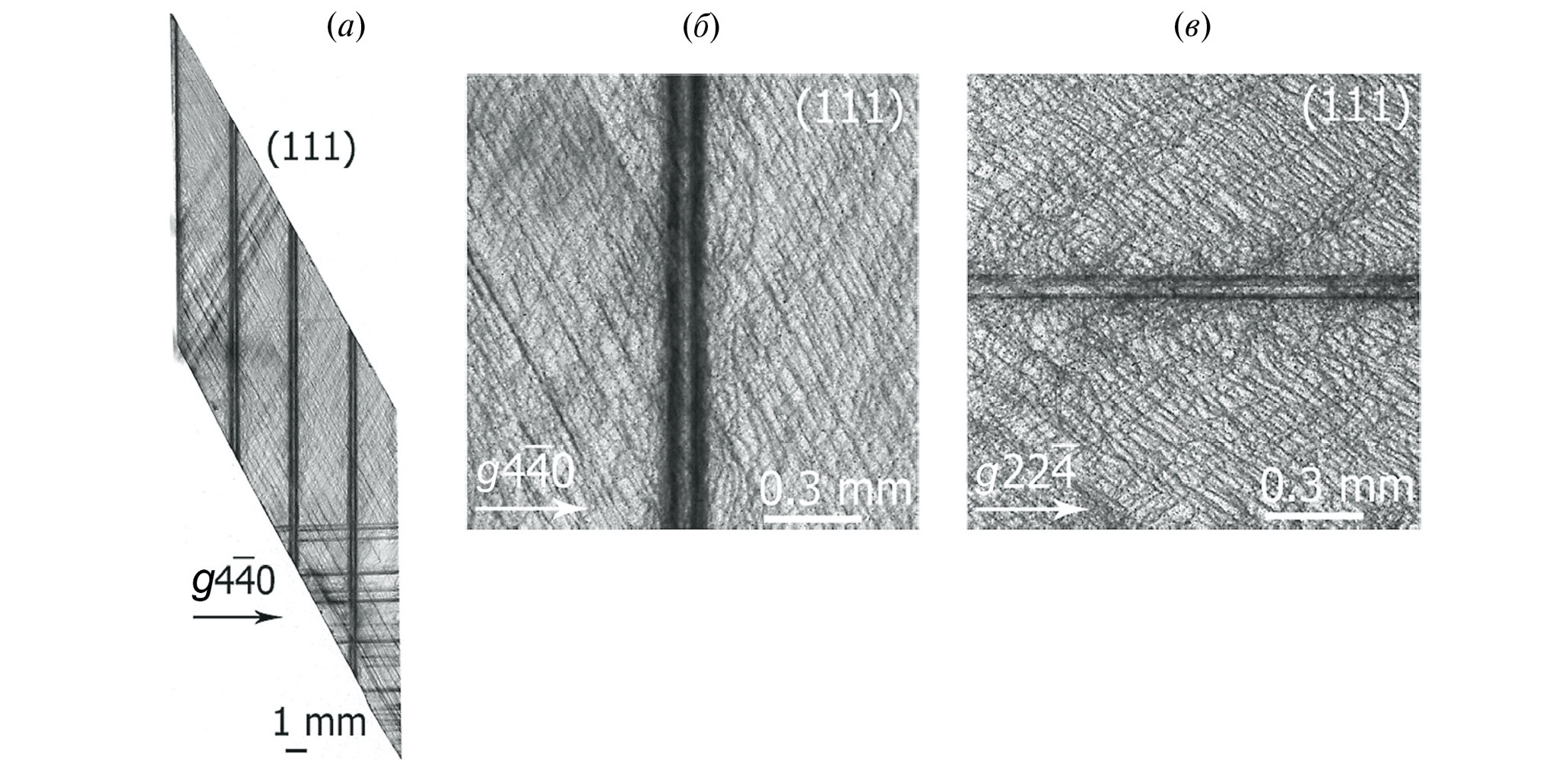 Рис. 5. Фрагменты проекционных топограмм с массивом сквозных вертикальных ThM каналов Si(Al), сформированных вдоль направления пластины Si(111). Отражения: g || () (а), (б) и g || () (в). Излучение AgKα₁.
