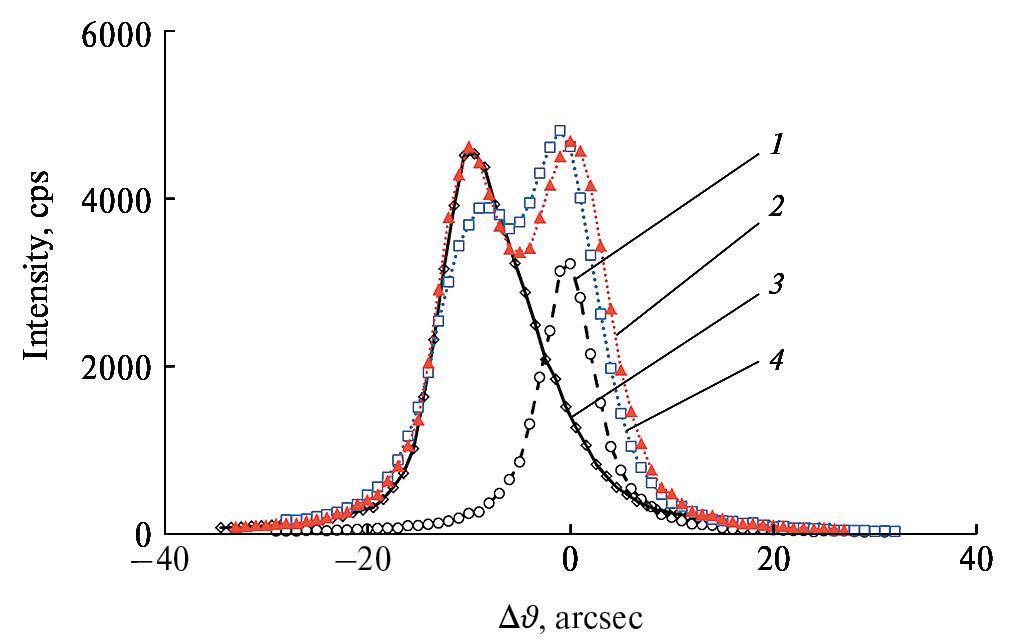 Видно, что форма, полуширина кривых и угловое положение максимумов зависят от величины сдвига х. Кривая LRC, записанная вдали от центра канала Si(Al), при x = 350 мкм или больших отступах имеет минимальную полуширину и более низкий коэффициент отражения. Ранее было показано [18], что такие кривые соответствуют дифракции от монокристаллов кремния. Это подтверждает, что несмотря на проведенный процесс термомиграции и появившиеся в объеме пластины дислокации (см. рис. 4) матрица пластины, в среднем, еще достаточно совершенна. При дальнейшем увеличении смещения x ≥ ±350 мкм от центра канала параметры кривой LRC (1) не изменялись вплоть до границы аналогичных полей деформации следующего канала. Анализ формы, ширины коэффициента отражения кривой LRC (3), полученной при падении рентгеновского пучка в центр канала при x = 0, показывает, что канал представляет собой достаточно совершенную монокристаллическую область. Этот результат подтверждает выводы рентгеновской топографии (см. рис. 5) о монокристалличности средней кристаллической решетки в канале. Вклад диффузного рассеяния от дислокаций в канале в кривую LRC (3), по-видимому, незначителен. Асимметричность “хвостов” кривой LRC связана с измененным межплоскостным расстоянием кристаллической решетки канала относительно матрицы пластины и структурными искажениями на его границе. Наличие искажений средней решетки на границе p-канал – матрица пластины хорошо демонстрируется кривыми (2) и (4) (см. рис. 6), на которых наблюдается два уширенных пика. В рамках теории упругости ожидаемое угловое расстояние между пиками на кривых (2) и (4) (луч излучения при смещении его относительно х = 0) захватывает канал и матрицу пластины) не может превышать 1–2 угловых секунды. Чтобы объяснить это несоответствие, появление двух пиков на кривых отражения в [18] было отнесено к заметным структурным искажениям кристаллической решетки в канале: деформация ε = 2.7 × 10–5, изгиб плоскостей, параллельных границе канала радиусом 1.7 м, и градиент деформации внутри канала ∇ε = 10–4.