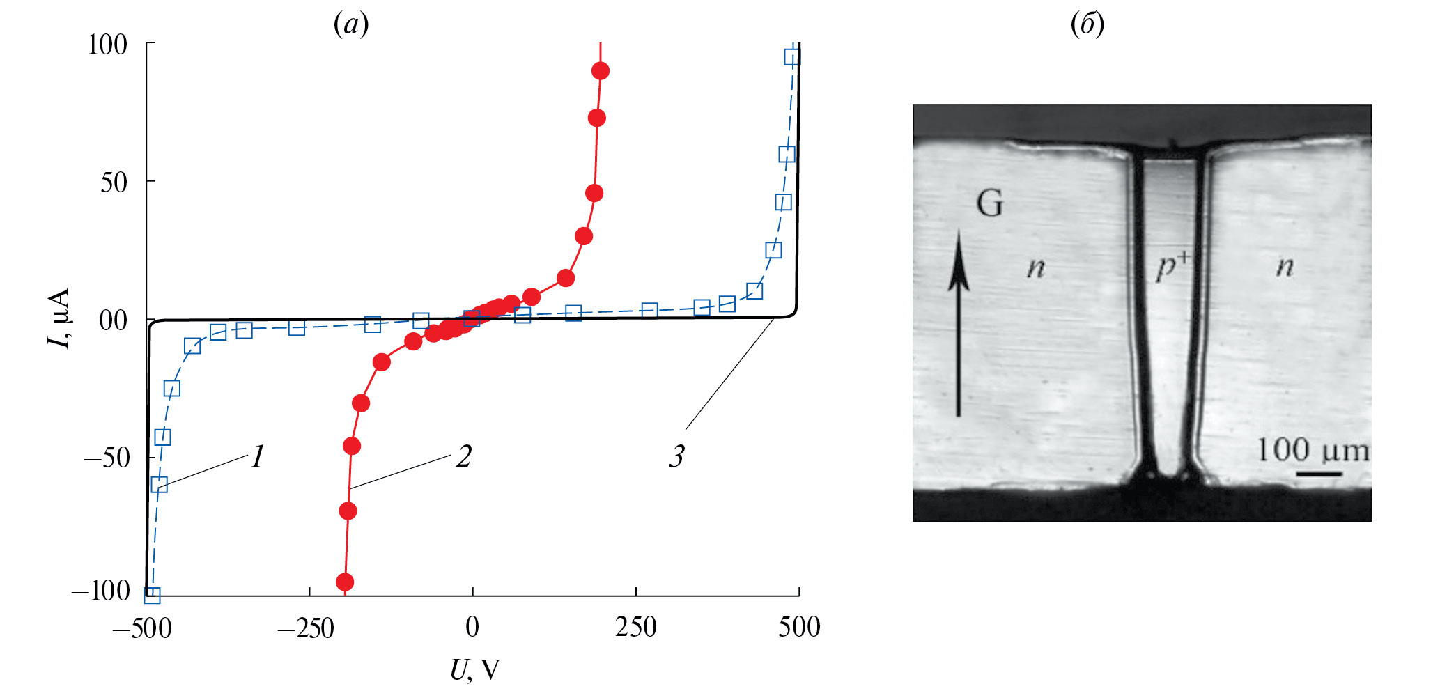 Рис. 7. Обратные характеристики I(U) (1, 2) для отдельных n—p—n-структур (см. рис. 1, б) образца и модельная кривая I(U) (3) для кремниевой пластины n-типа (Р, 10¹⁴ см⁻³) (а); металлургическая микрофотография канала SiAl (б); G — направление градиента температуры при термомиграции.