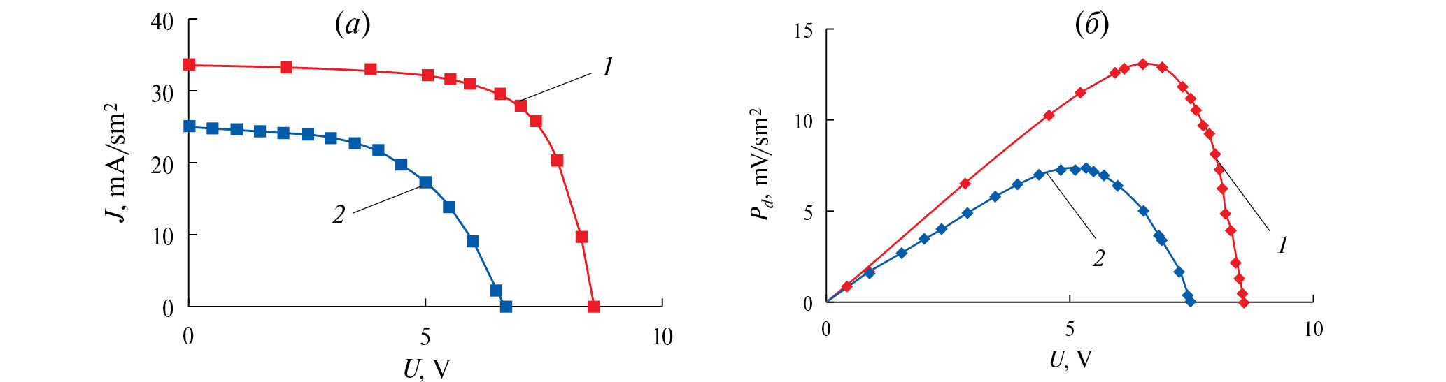 Рис. 9. Характеристики J — U (а) и Pd — U (б) для монолитных солнечных модулей MHSM при мощности излучения 1000 Вт/м². На обоих рисунках: 1 — эталонный модуль #A; 2 — дефектный модуль #B.