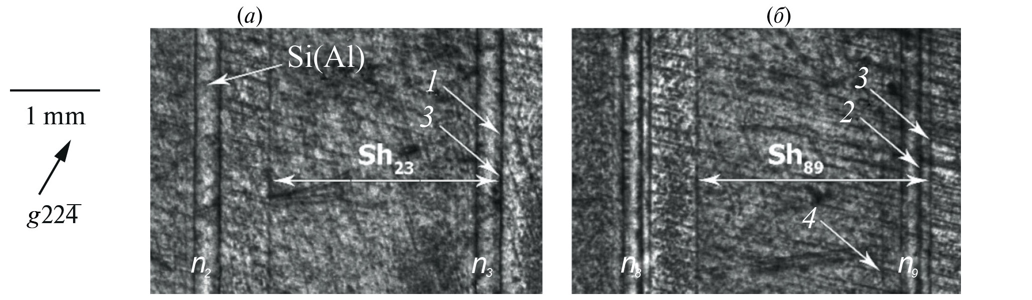 На рис. 11, a и б хорошо видны дифракционные изображения р-каналов Si(Al) n₂, n₃, n₈ и n₉ в виде параллельных более светлых полос с боковыми тонкими черными линиями, аналогичных полосам, показанным на рис. 5, в. Хорошо проявляются (срав. с рис. 2) границы серебряных шунтов Sh₂₃, Sh₈₉ между р-каналами n₂, n₃ и n₈, n₉. Правые границы шунтов Sh₂₃ и Sh₈₉ отмечены стрелками 3. Наиболее интересно расположение рабочих p—n-переходов, совпадающих с границами каналов: (n₂, n₃) и (n₈, n₉) соответственно. Стрелки 1 и 2 указывают “рабочие” границы каналов n₃ и n₉ во фрагментах (а) и (б) соответственно. Видно, что расположение правой границы 3 контактной пленки Sh₈₉ выходит за пределы канала и попадает в область матричного кремния. Такое относительное смещение границ р-канала и шунта вероятнее всего приводит к короткому замыканию рабочего p—n-перехода на тыльной стороне модуля. Этот размерный дефект наблюдается, начиная с 8-го канала для модуля #В. Подчеркнем, что для первых семи каналов модуля границы канала с рабочим p—n-переходом и границы шунта Ag совпадают. Такое смещение границы контактной пленки (3) на фрагменте (б) должно привести к короткому замыканию рабочего p—n-перехода и уменьшению значений тока. Это наблюдение полностью соответствует форме кривой, показанной на рис. 10, а, где наблюдается резкое уменьшение тока короткого замыкания Jsc, начиная с канала 7. Мы полагаем, что смещение границ, а также уменьшение ширины каналов SiAl обусловлены наличием радиального градиента теплового поля в процессе термомиграции. На полной топограмме MSСM слева от каналов видны слабые черные линии (стрелка 4). Их положение соответствует границе разделительной канавки между солнечными элементами. Возможно, что процесс лазерной абляции, образовавший разделительные канавки, был нестабильным.
