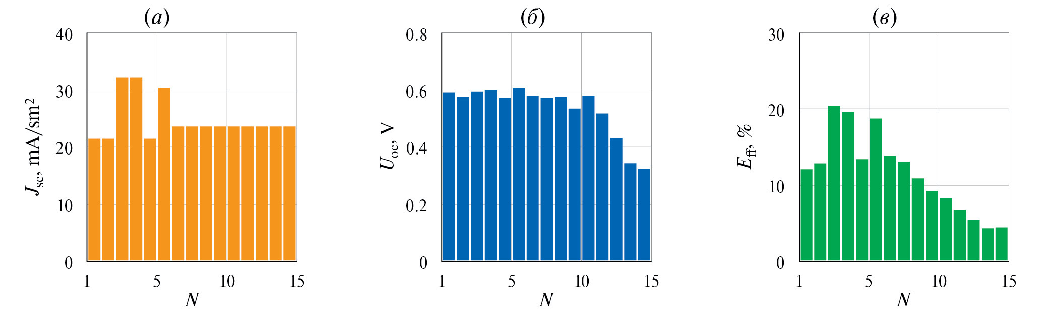Чтобы изучить фотоэлектрические свойства модуля, мы измерили значения Jsc, Uoc и Eff для каждого солнечного элемента. Результаты представлены на рис. 10.