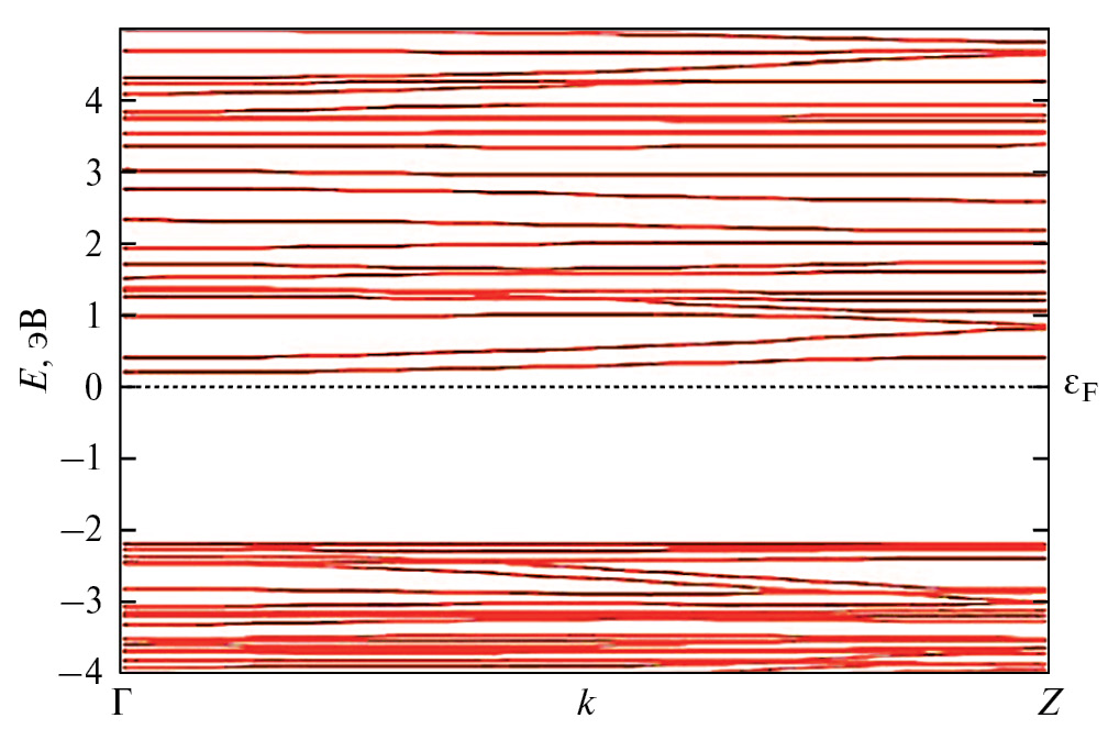 Рис. 2. Зонная структура соединения TlGaS₂, рассчитанная методом DFT GGA-PBE. Состояния в области отрицательной энергии принадлежат валентной зоне, а состояния в области положительной энергии принадлежат зоне проводимости.