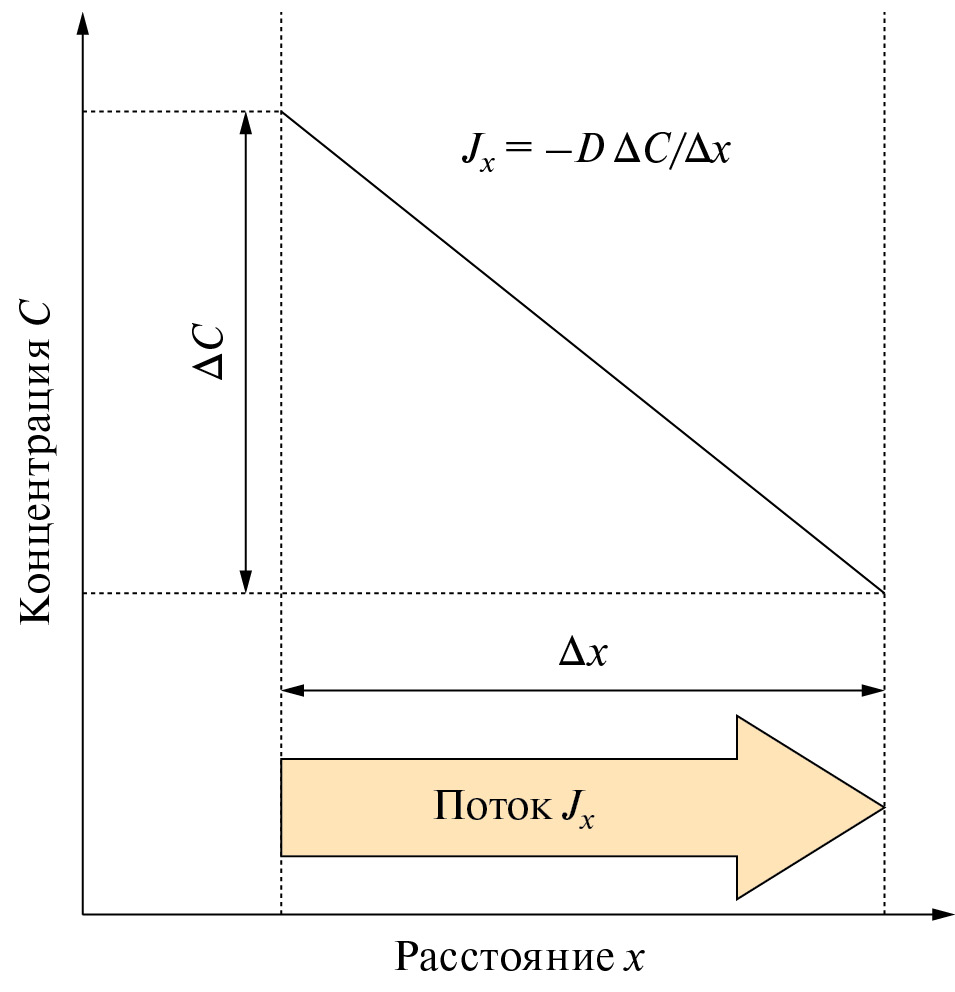 Рис. 3. Иллюстрация первого закона Фика. Частицами могут быть атомы, молекулы или структурные компоненты TlMS₂. Первый закон Фика для изотропной среды записывается как Jₓ = —D(∂C/∂x), где Jₓ — поток частиц (диффузионный поток); C — плотность частиц (концентрация); D — коэффициент диффузии (или коэффициент пропорциональности) рассматриваемых типов частиц. Знак “минус” в этом уравнении указывает на противопо-ложные направления диффузионного потока и градиента концентрации.